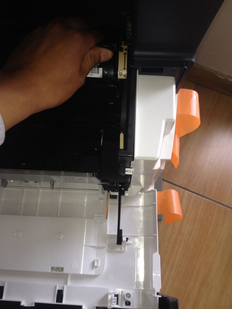 5.- Colocar el tóner dentro de la Unidad de Imagen sacando todas las cintas que vengas en el suministro verificando a los lados las guías para que ingrese correctamente.