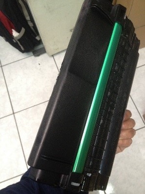 2.- Extraiga el cartucho de tóner del envoltorio y tire de la cinta adhesiva para quitar el papel que lo cubre.